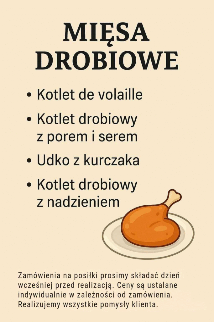 Dania główne – schabowy, devolay, udko z kurczaka, mielony z serem, kotlet po zbójnicku.