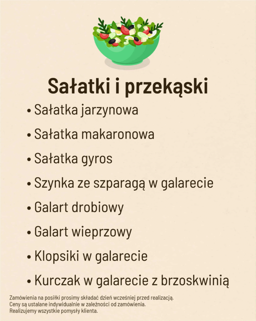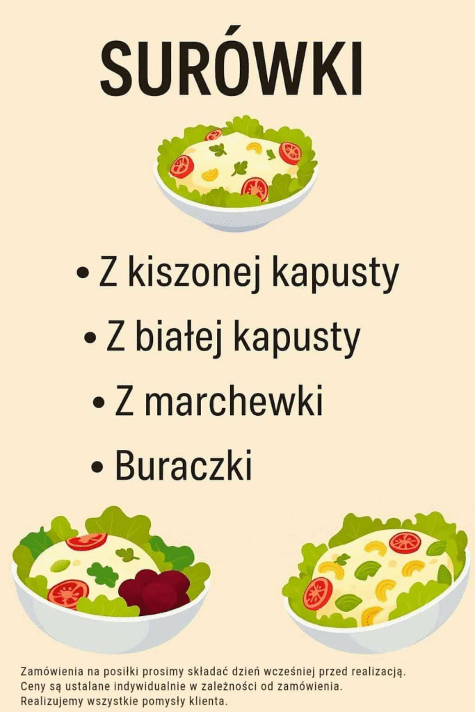 Surówki i sałatki – z kiszonej lub białej kapusty, z marchewki, buraczki, jarzynowa, makaronowa, gyros.