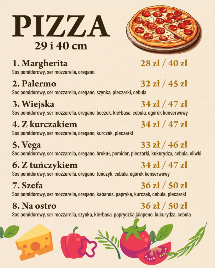 Pizza prosto z pieca – chrupiąca, pełna aromatu, w różnych rozmiarach i smakach (Margherita, Wiejska, Palermo, Na Ostro, Szefa).