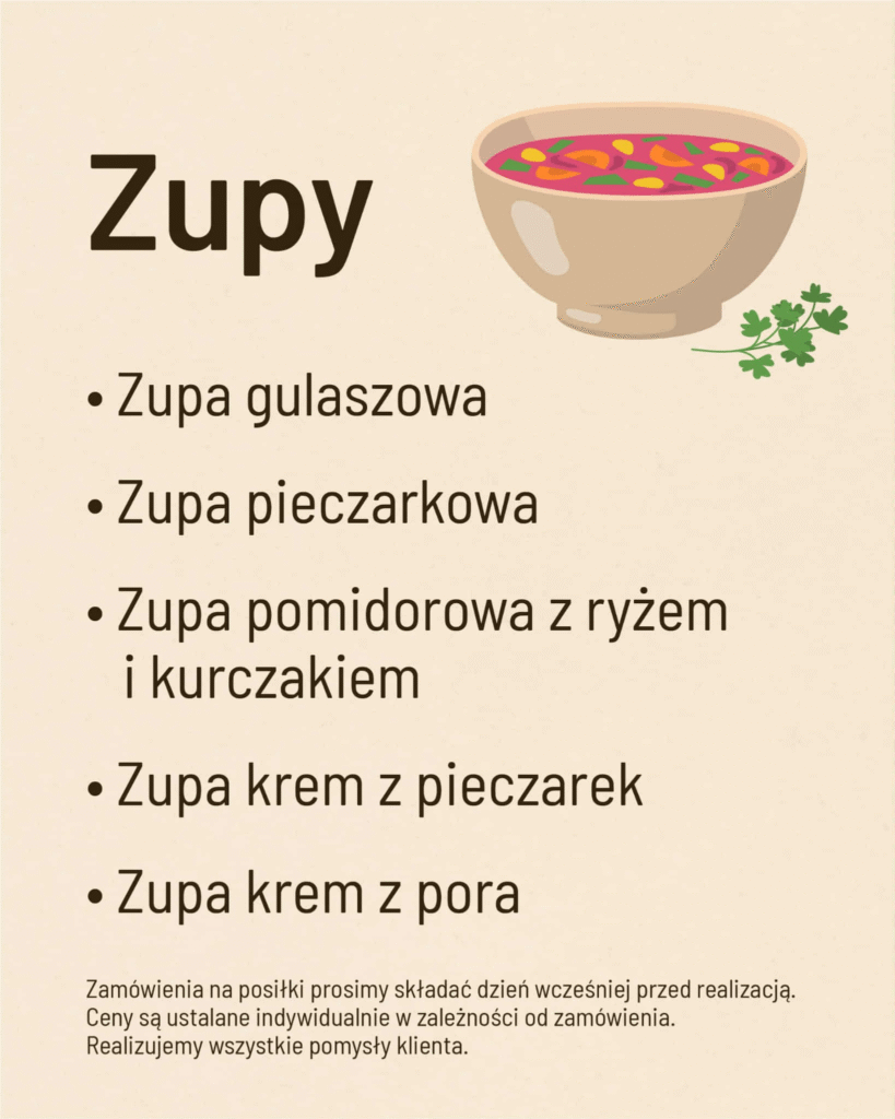 Zupy i kremy – gulaszowa, pomidorowa z ryżem, pieczarkowa, z pora i inne.