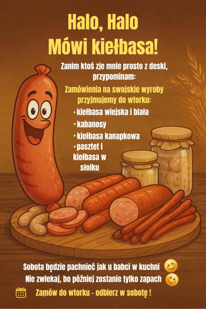 Swojskie wyroby – kiełbasa wiejska i biała, kabanosy, pasztet, kiełbasa w słoiku, domowy smalec.