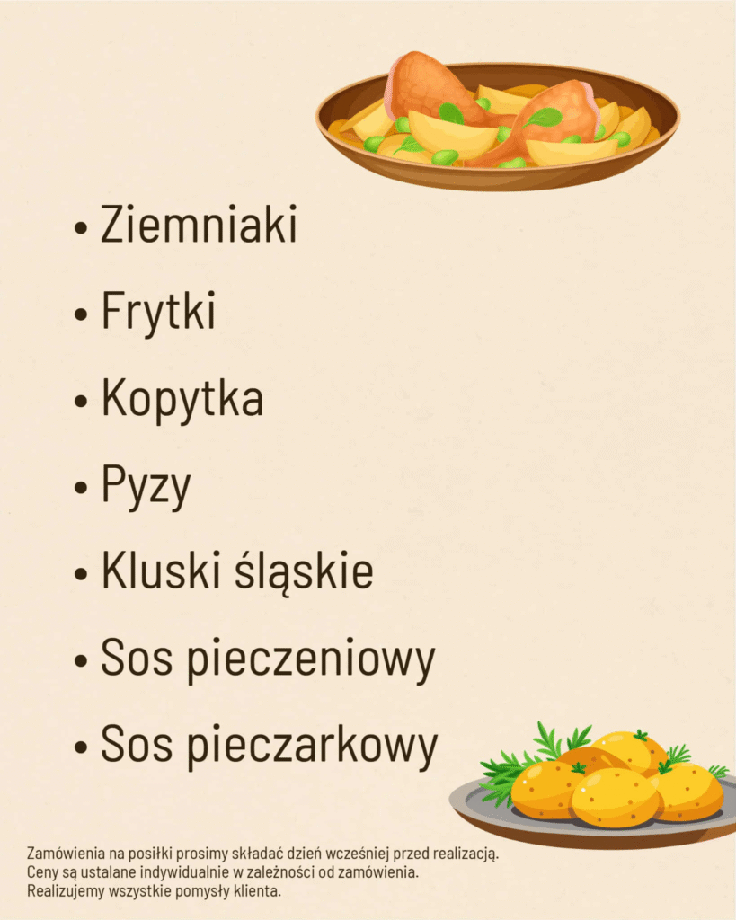 Dodatki – ziemniaki, kluski śląskie, pyzy, kopytka, sos pieczeniowy, sos pieczarkowy.